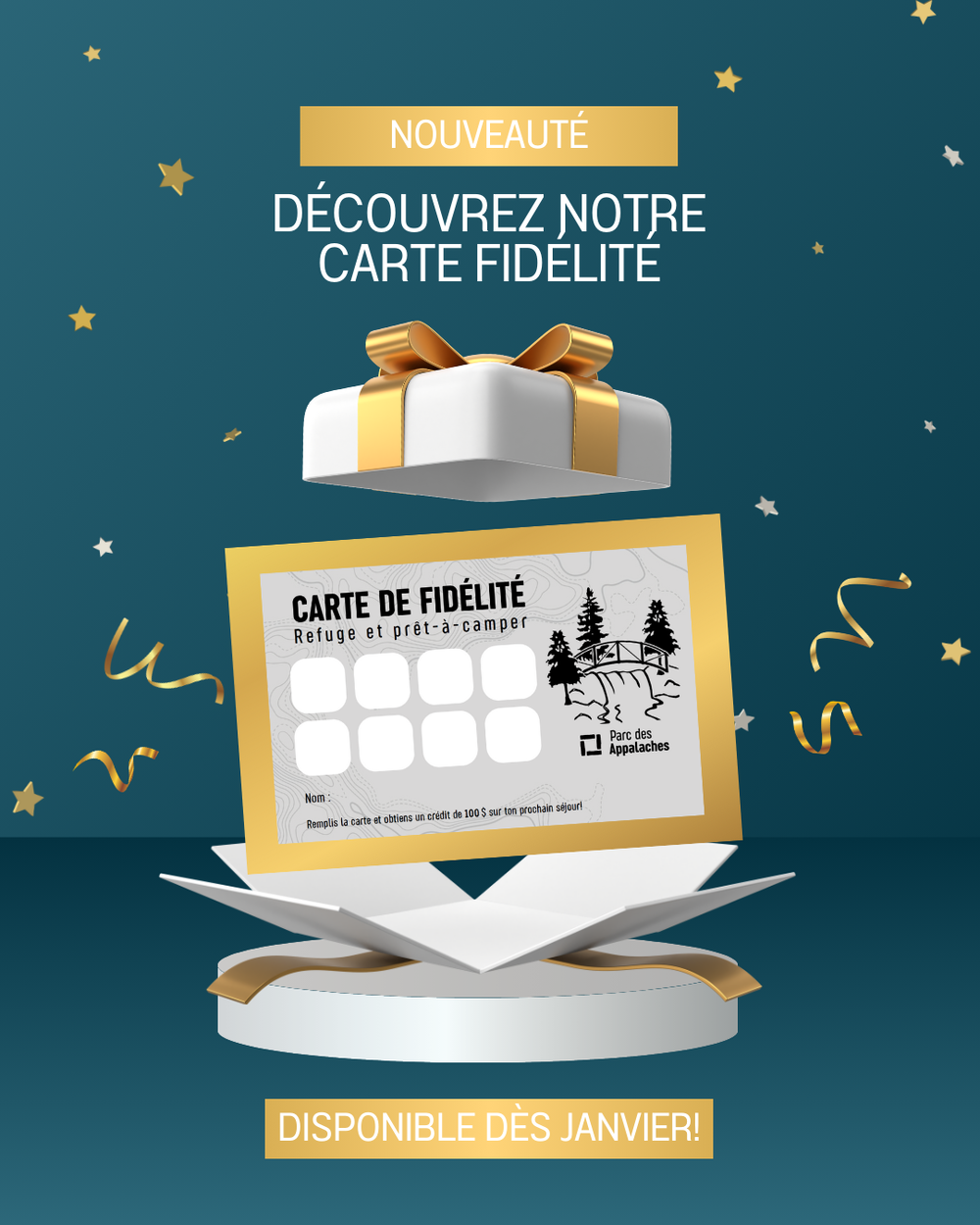Cette carte sera valide pour les séjours en refuge, ainsi que pour les séjours en camping. Le principe est simple! Passez une nuit et obtenez un point, passez deux nuits et obtenez deux points... Vous devez vous présenter dans l'un de nos accueils pour faire tamponner votre carte. À chaque carte complétée, vous recevrez un crédit applicable sur votre prochain séjour!